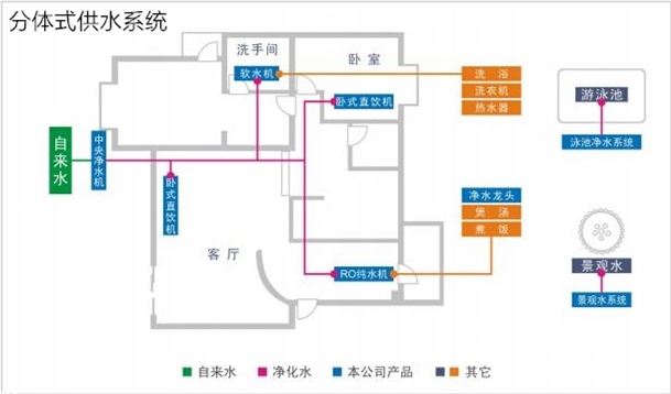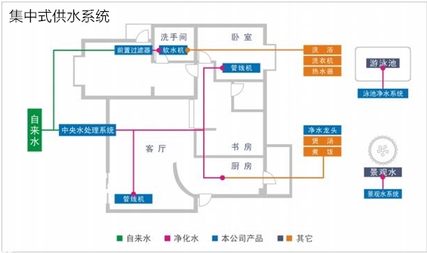 集中式供水系统特点:把控全局,只需一台中央水处理设备就能达到全屋净水效果。