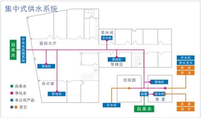 医疗集中式供水系统特点:把控全局,只需一台中央水处理设备就能达到全屋净水效果。